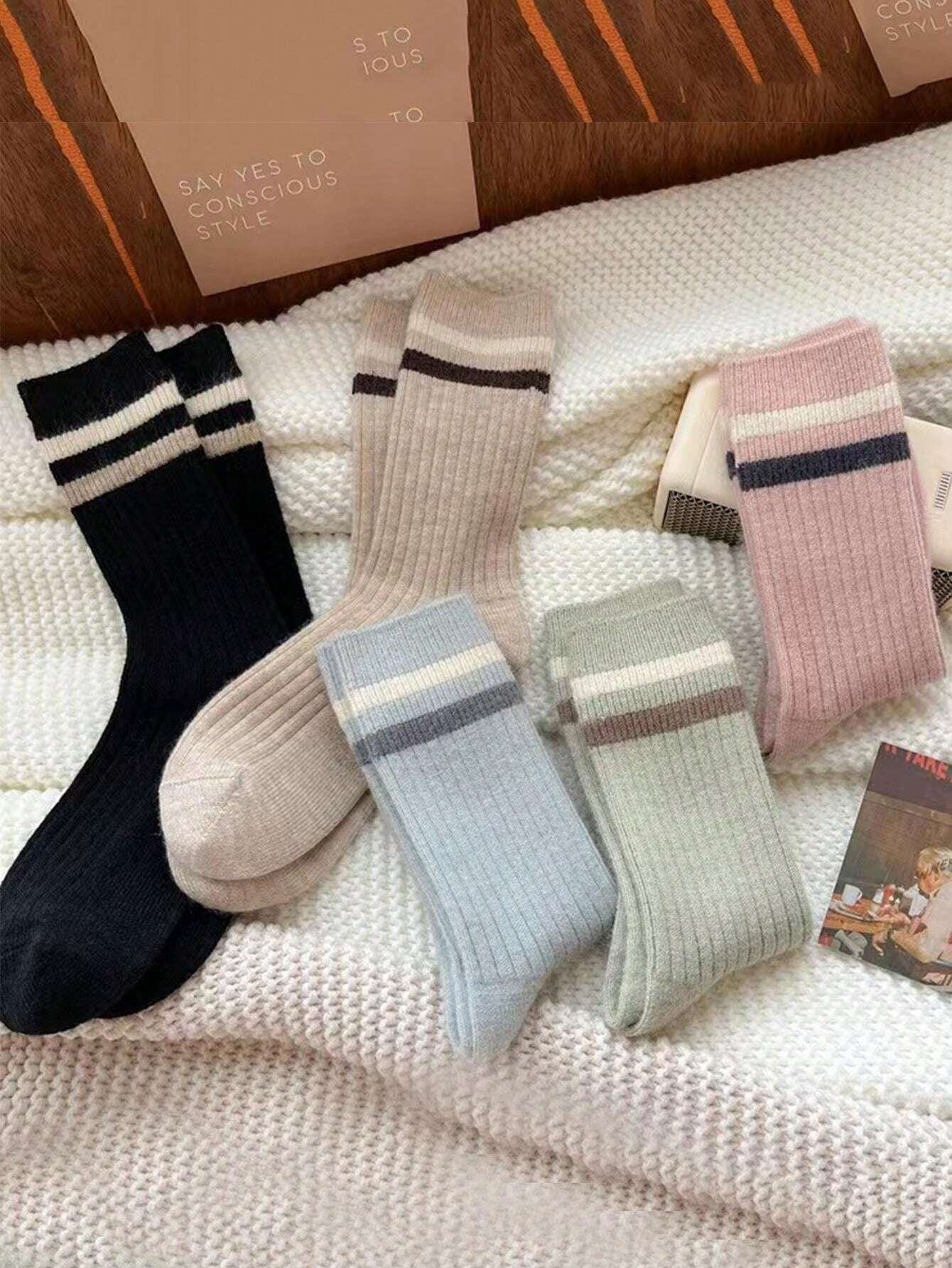 Keep your feet cozy and stylish with our ribbed crew socks. Featuring a classic striped design at the cuff, these socks come in a versatile range of colors: black, sage green, light blue, soft pink, and neutral beige. The ribbed texture provides a comfortable and secure fit, perfect for everyday wear. Made from a soft and breathable blend, these socks are a must-have for your wardrobe.