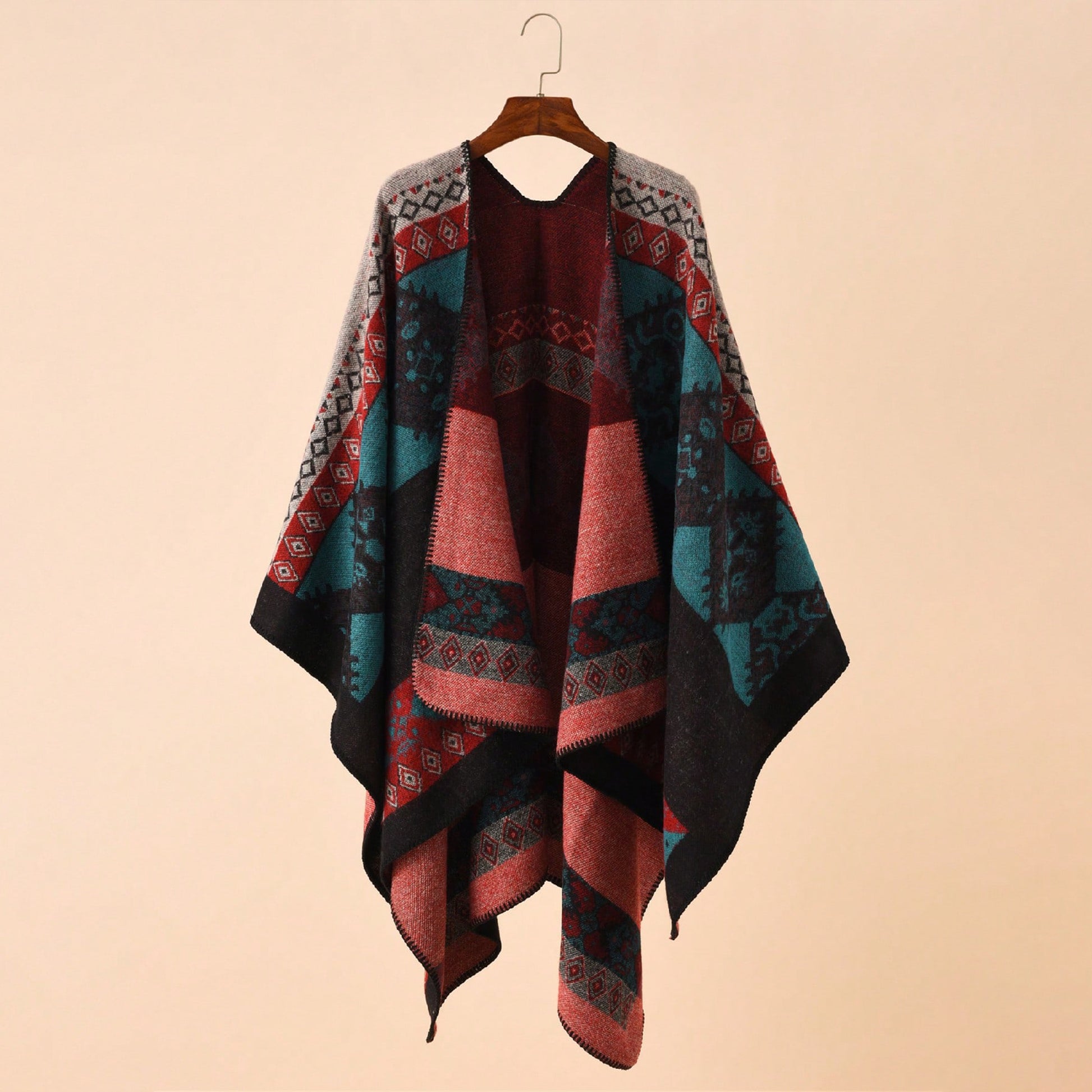 Wrap yourself in style and comfort with this stunning Boho Aztec Geometric Poncho. Featuring a rich blend of burgundy, deep teal, and black in a striking tribal pattern, this open-front cape is the perfect layering piece for the cooler months.
