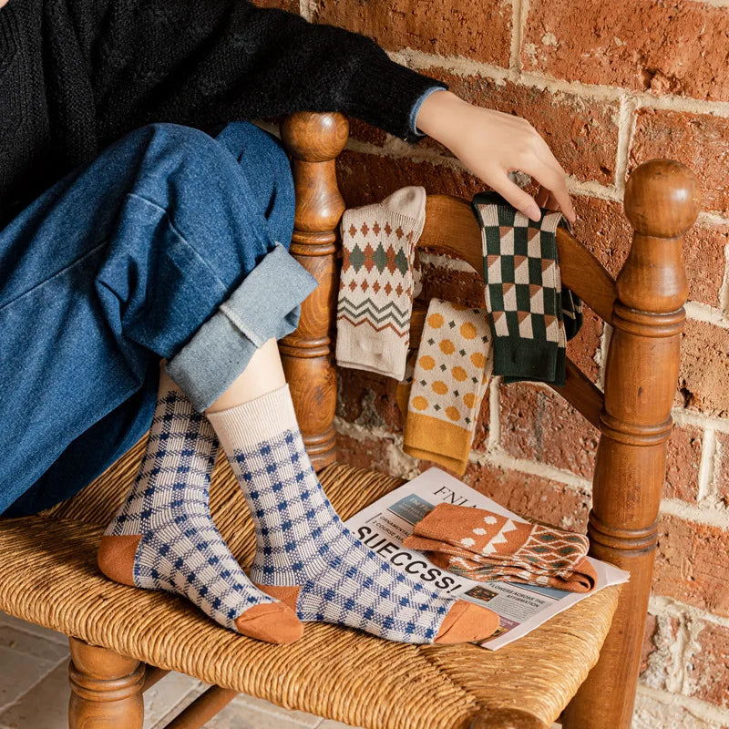 Step into comfort and style with our Cozy Retro Patterned Crew Socks. This 5-pair set features unique vintage-inspired designs in warm earthy tones of navy, rust orange, mustard yellow, forest green, and cream. Made with a soft, breathable cotton blend, these socks are perfect for everyday wear, keeping your feet warm and stylish all year round.