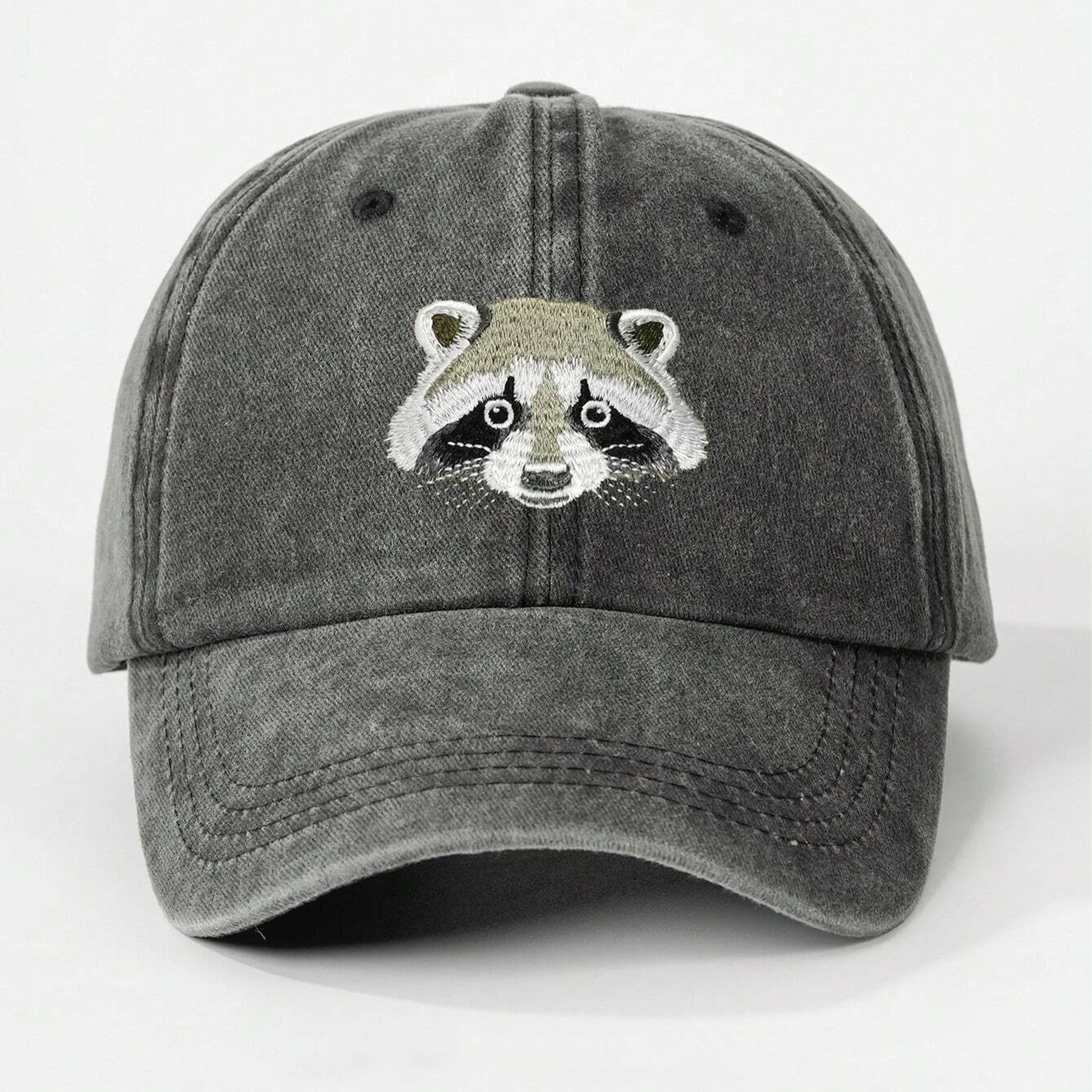 Add a touch of playful charm to your everyday style with our Raccoon Embroidered Dad Hat. Crafted from soft, washed cotton for a vintage, worn-in look, this charcoal-black cap features a detailed embroidered raccoon face that brings character without shouting for attention.